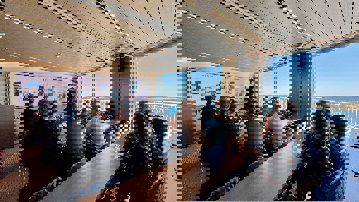 Konferera ombord var toppen i nya, fräscha lokaler där gofika ingick. Innan lunchen fick vi en exklusiv visning av färjan med pursern Eeva Santalahti, där kommandobryggan blev dagens absoluta höjdpunkt! Någon frågade: “Var är ratten?” – och kaptenen visade då en joystick, mindre än en Nintendo-kontroll! De berättade också att när de ska lägga till ställer de sig på en glasruta, utanför båtens bredd med 25 m fallhöjd för att se dockningen och hålla koll på de små marginalerna! Det var både läskigt och imponerande.