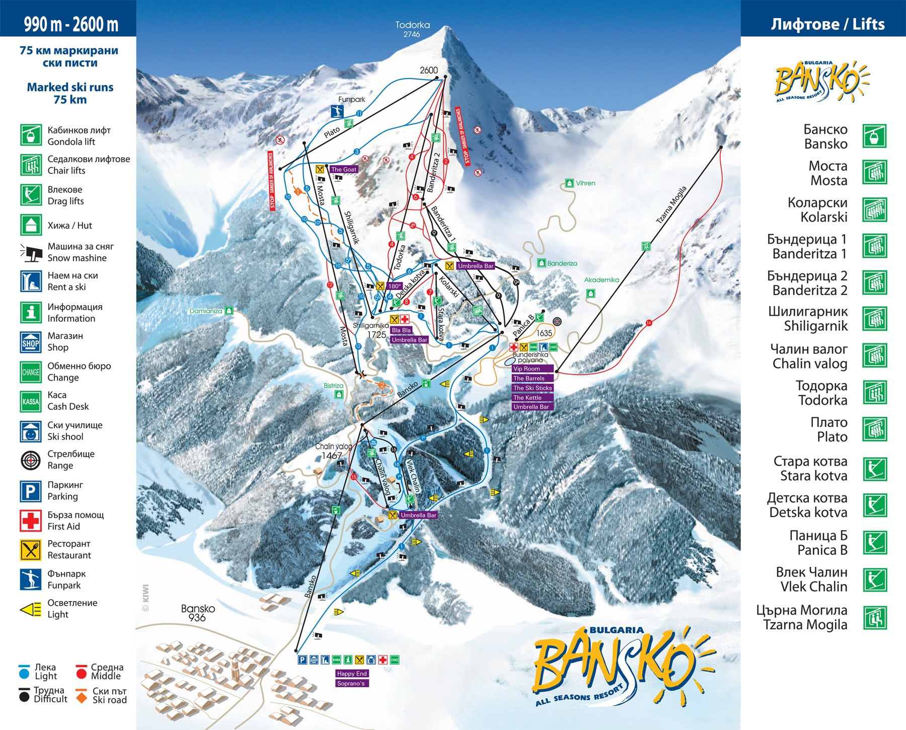 Totalt finns ca 70 km pist varav flera kilometerlånga härliga backar. Här finns snökanoner och pistmaskiner, vilket inte är något att ta för givet i övriga Bulgarien.