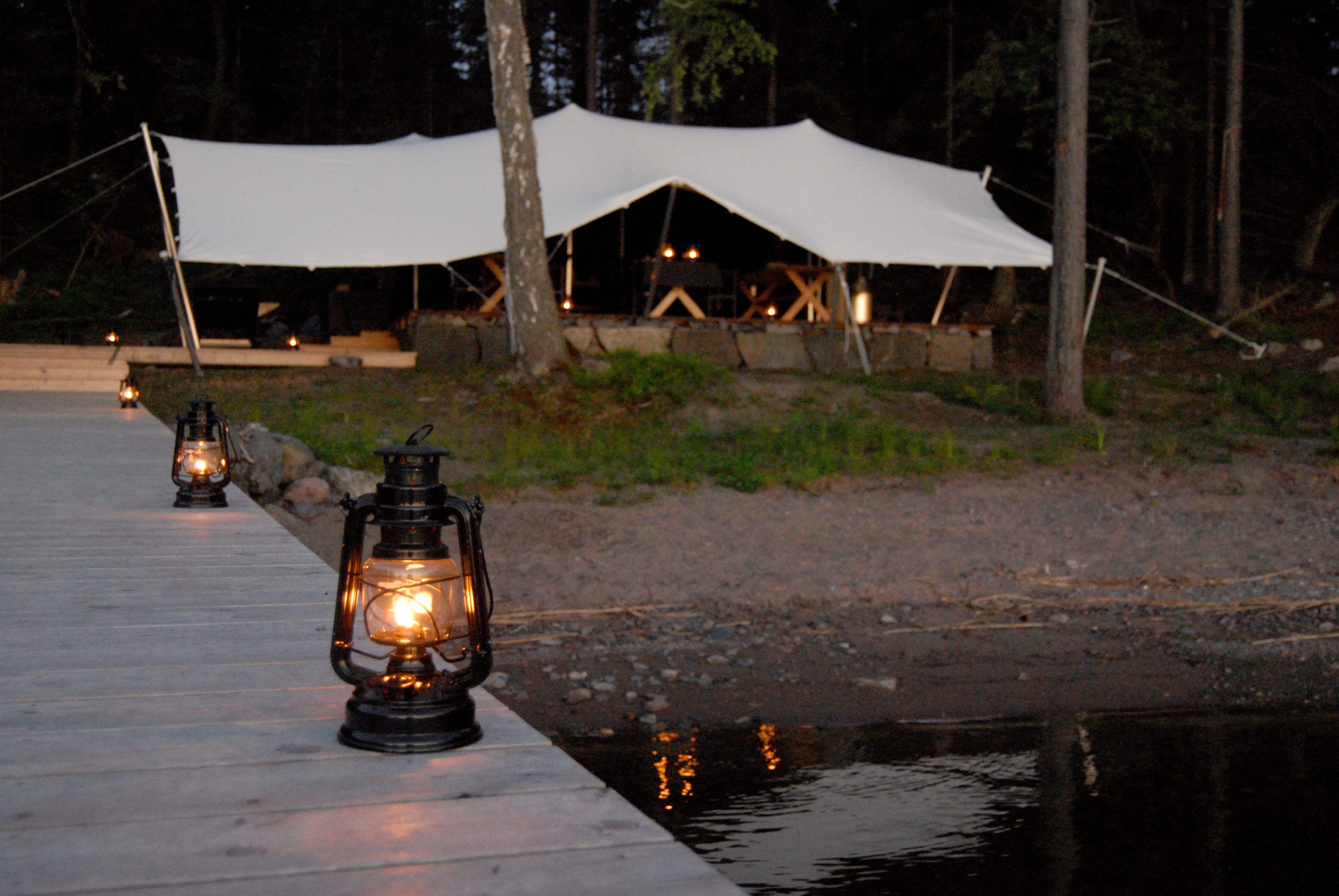 Tälten är 18kvm stora, med 6 runda fönster med möjlighet att byta ut mot myggnät. Både sängar och sängkläder är av bästa kvalitet och tälten är belägna på noga utvalda platser med vacker utsikt över skärgården. En vedeldad kamin håller dig varm på kalla dagar och fotogenlampor lyser upp tältet efter mörkrets ingång. Island Lodge vill ge den bästa eco-lodge upplevelse i Skandinavien och siktar på att vara CO2 neutralt. Här handlar det om att vara ett med naturen. Här finns en grillplats, möjlighet att äta middag vid havskanten, vedeldad badtunna för 10pers, bastuflotte för 14pers och om inte det räcker så har du även en privat ö och strand. Självklart finns det duschmöjligheter och även wifi i konferenslokalen.