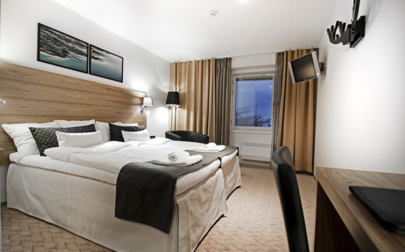 Vid fjällkanten ligger fyrstjärniga Hotell Fjället, som ni kan ha helt för er själva om ni önskar. Här finns totalt 46 rum. Ni äter gott på hotellets restaurang och hänger i hotellets Bar Rallaren. En kväll rekommenderar vi middag i hotellets träkåta.