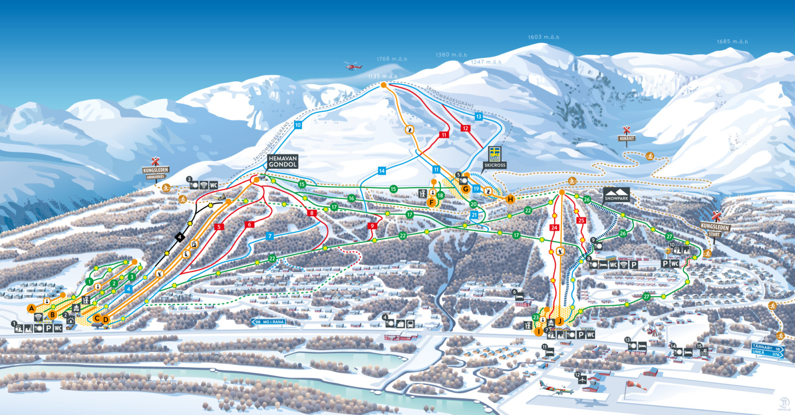 Hemavan erbjuder en mysig och varierad skidupplevelse för alla nivåer. Skidområdet har totalt 9 liftar, 36 nedfarter, 3 barnområden, två Snowparks och en Skicross-Arena, vilket ger både nybörjare och erfarna åkare gott om möjligheter. Efter en dag i backarna kan man njuta av ett brett utbud av restauranger, där Björk – Topprestaurang & Fjällbar, ett arkitektoniskt mästerverk, erbjuder både god mat och fantastisk utsikt över fjällen.