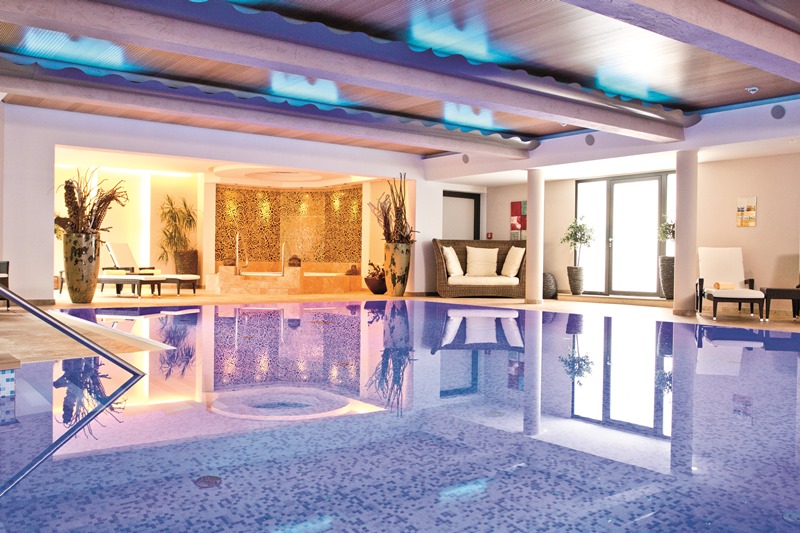 Här finns en 1500 kvm stor spaavdelning med panoramautsikt över bergen med inomhuspool, bastu, bubbelpool, infraröd kabin och ångbad.